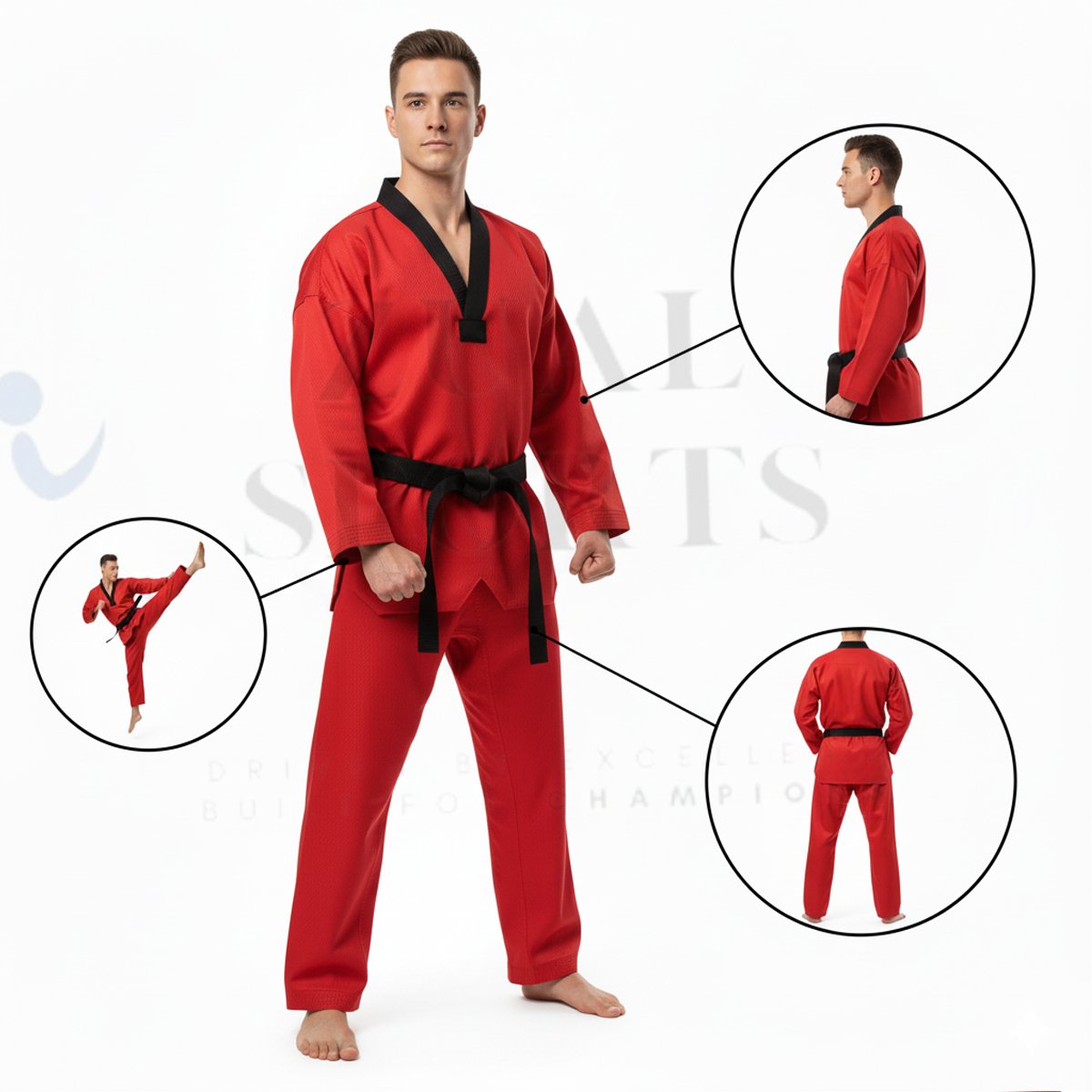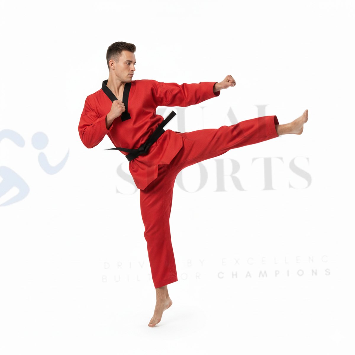 Train with confidence in the EliteStrike Red Taekwondo Dobok for Men, designed for durability, comfort, and high performance. Inspired by professional taekwondo competition uniforms, this dobok offers a traditional look with modern comfort, making it ideal for both daily training and official use.