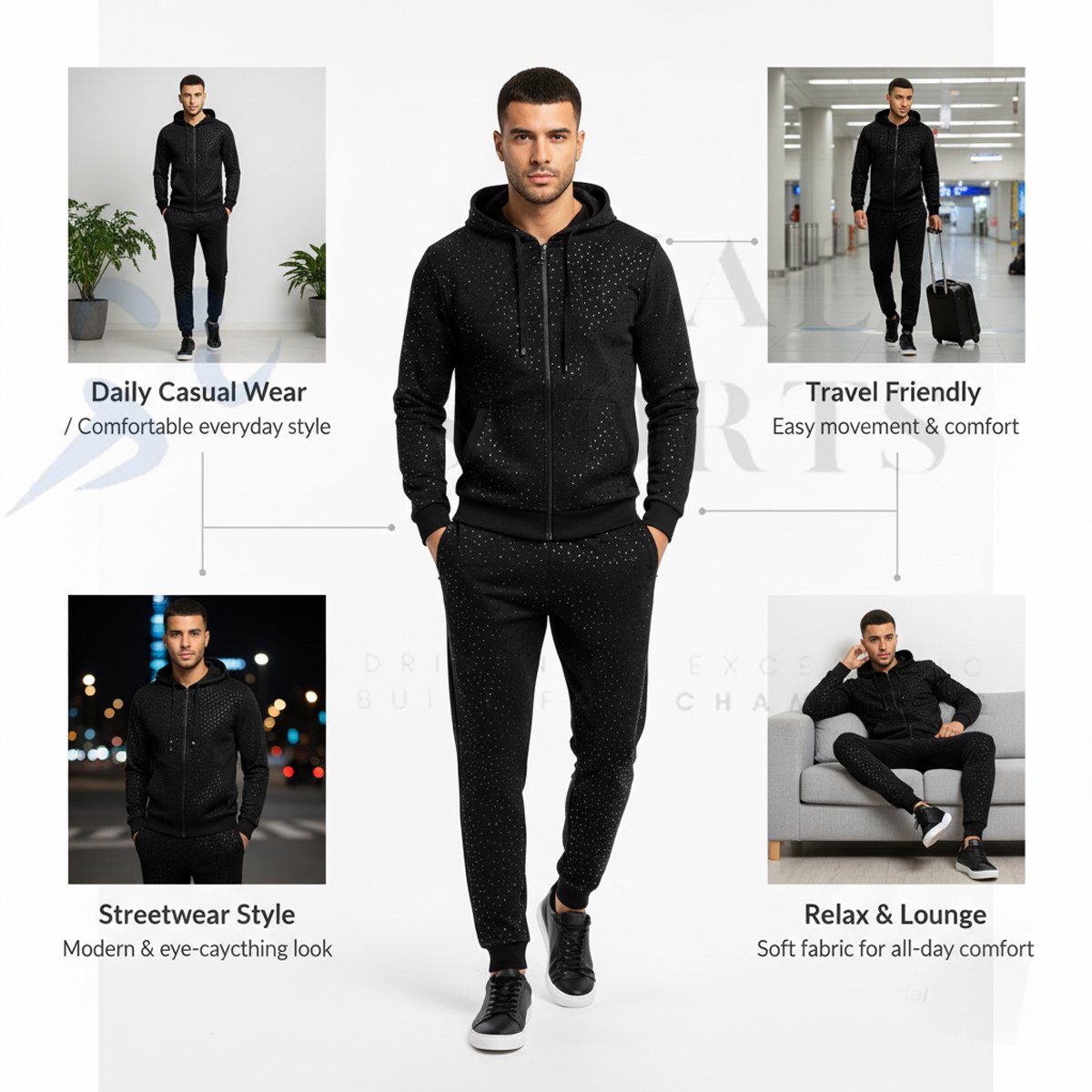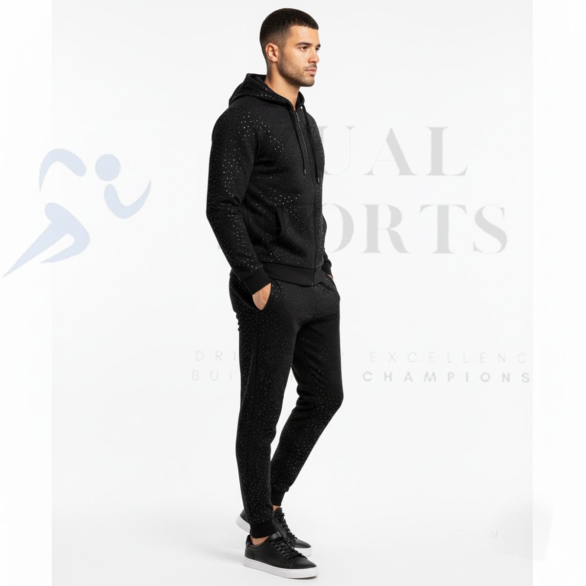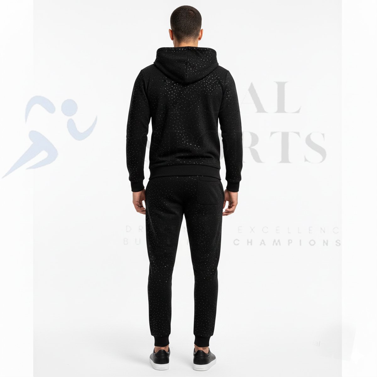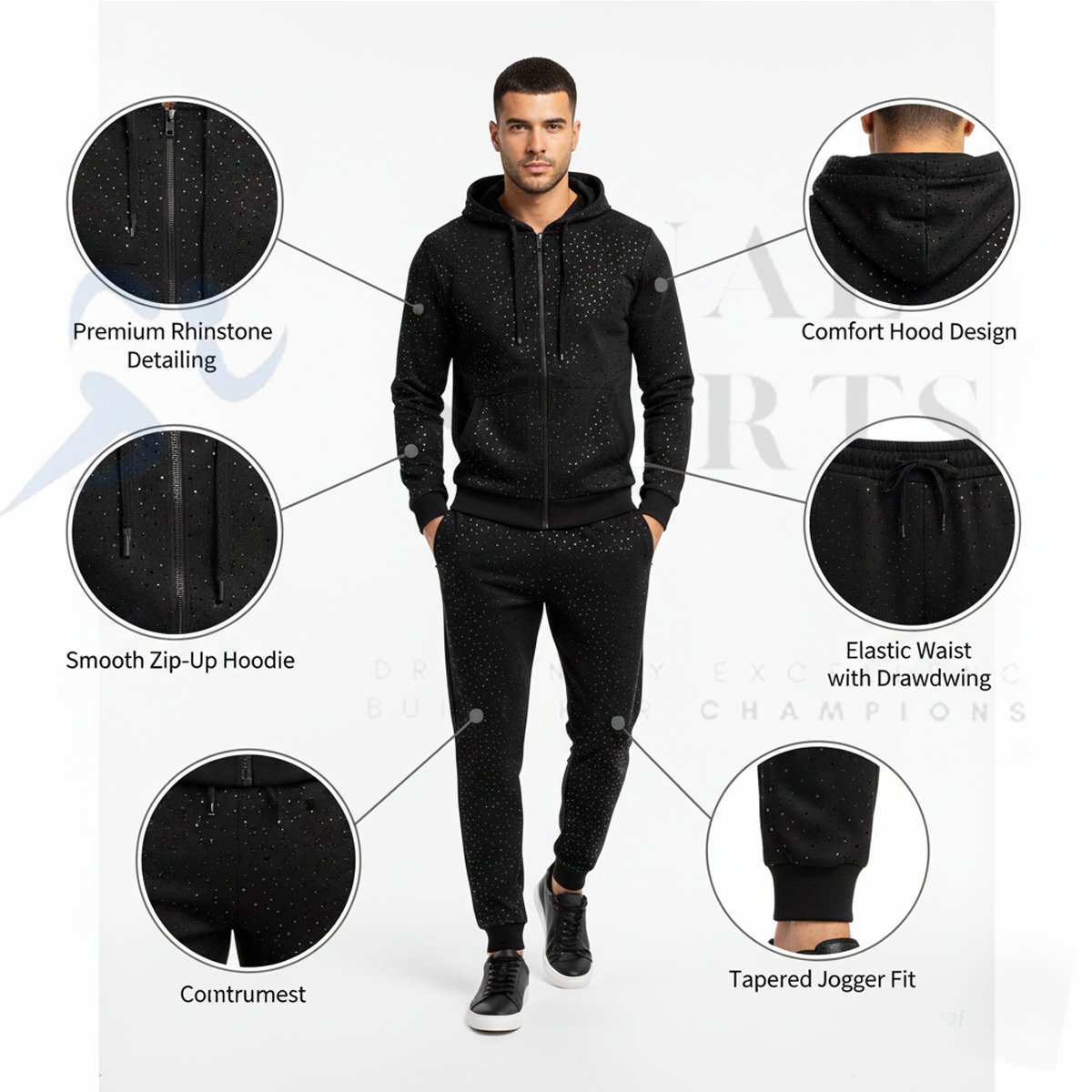 Step up your style with this men’s rhinestone tracksuit, crafted for those who want comfort without compromising on a bold, modern look. The set includes a zip-up hoodie and matching joggers, finished with subtle rhinestone detailing that adds a premium streetwear vibe.